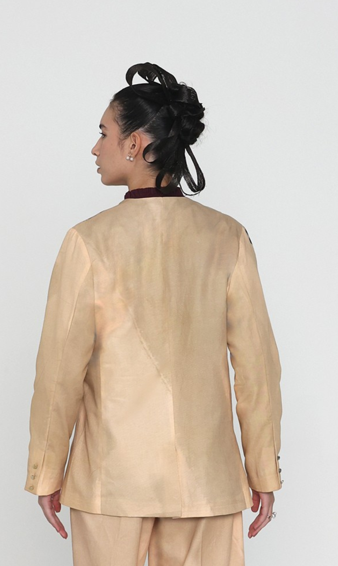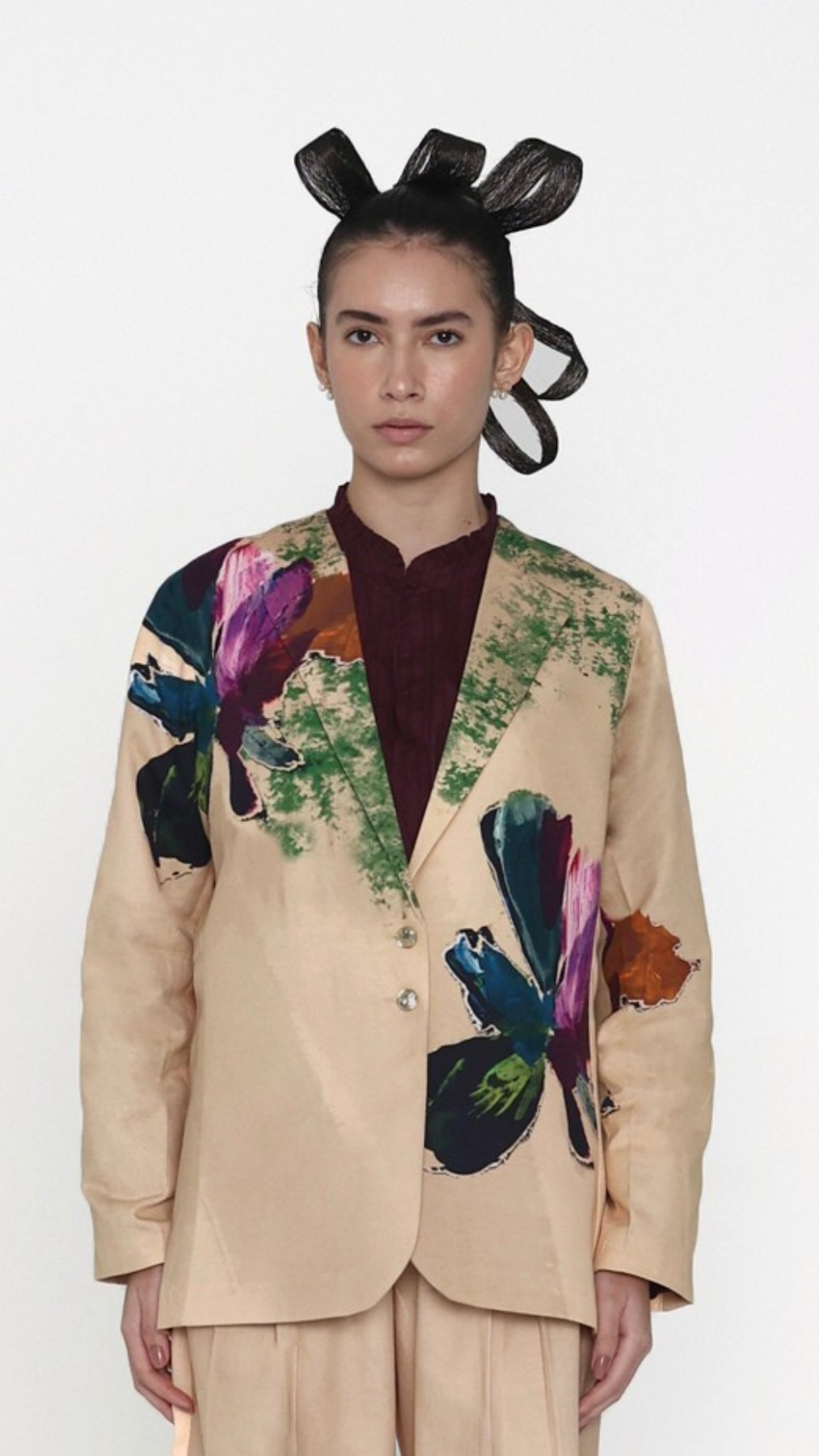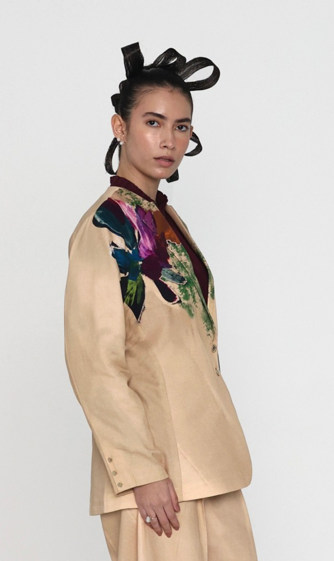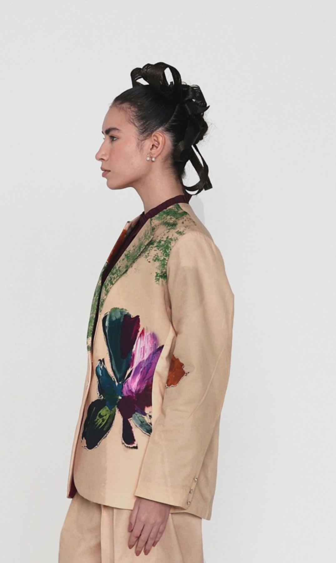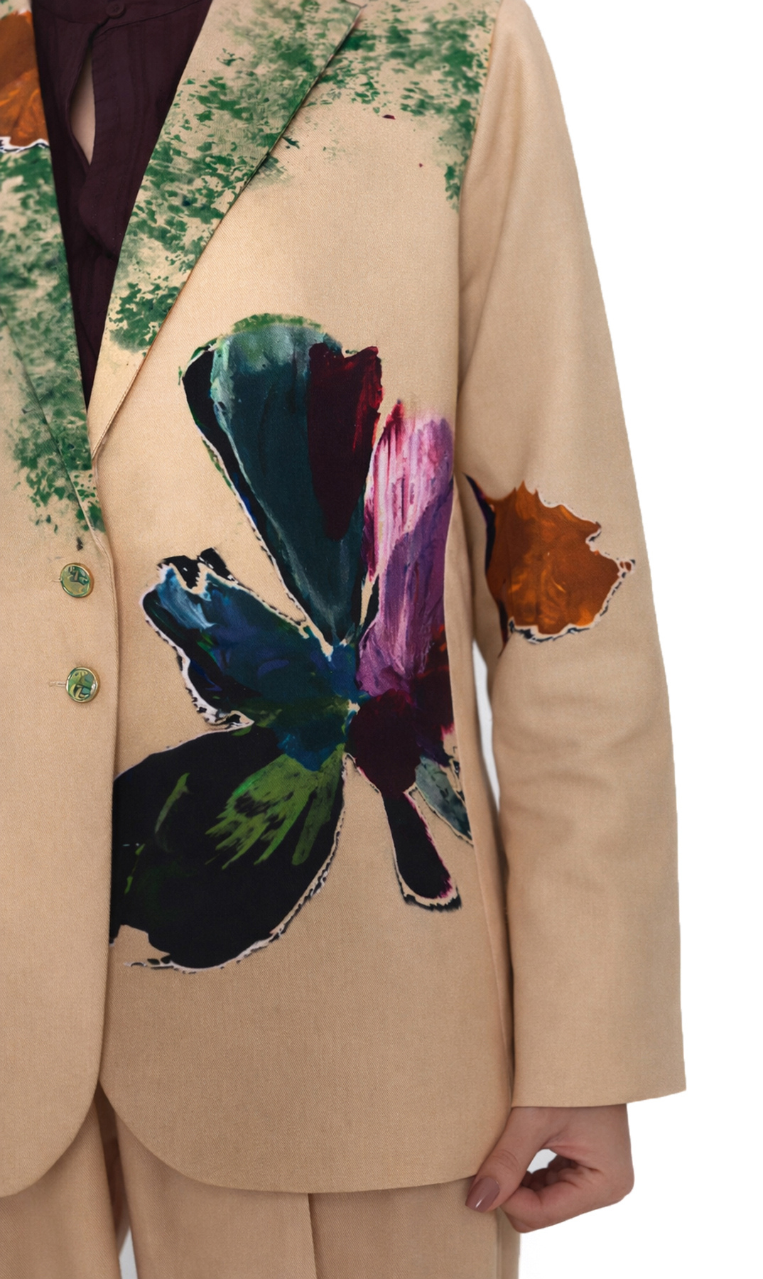The Abstraction Blazer in beige cotton twill, a sophisticated blend of structured tailoring and expressive art. This ensemble features a single-breasted blazer highlighted by vibrant, abstract botanical motifs across the shoulders and lapels,