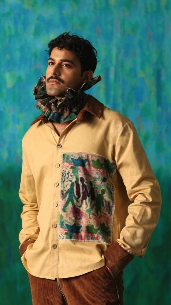 The Alchemy top features a narrative based applique on front and extended cotton corduroy collar.