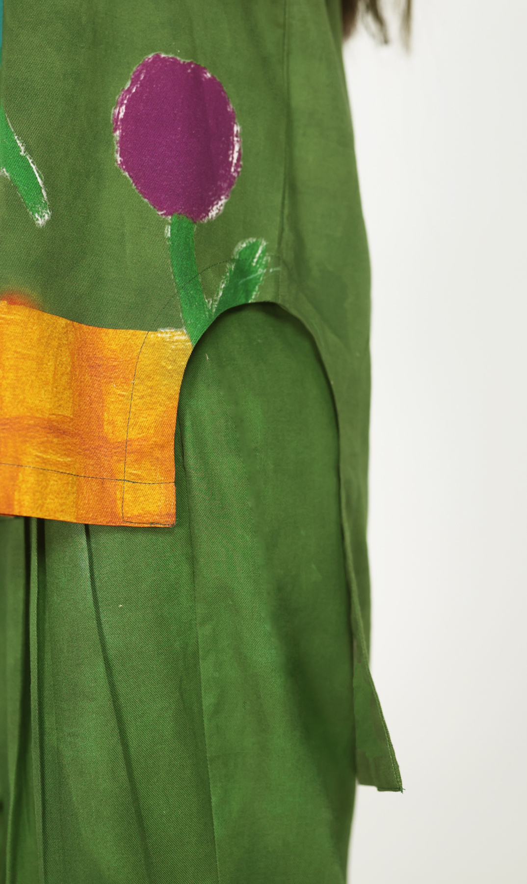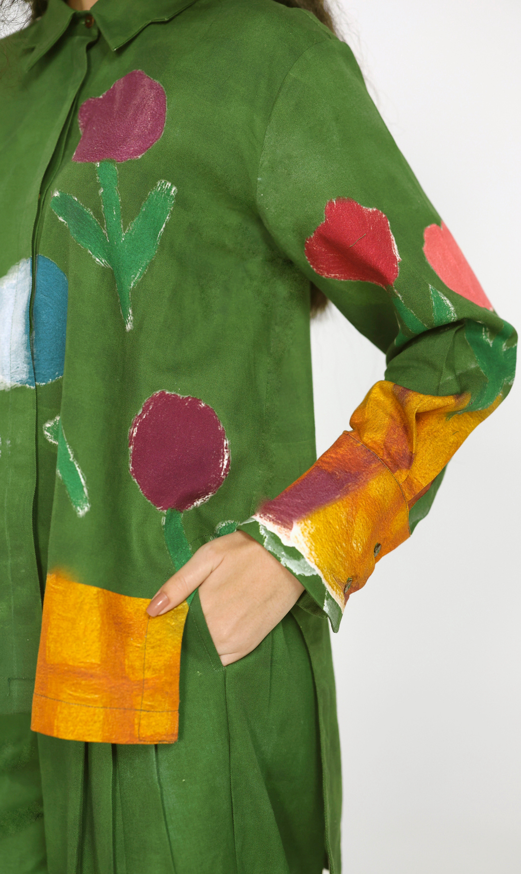 The bloom set features a structured forest green button-down shirt with a narrative based art work