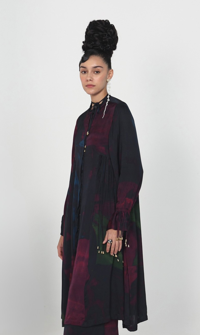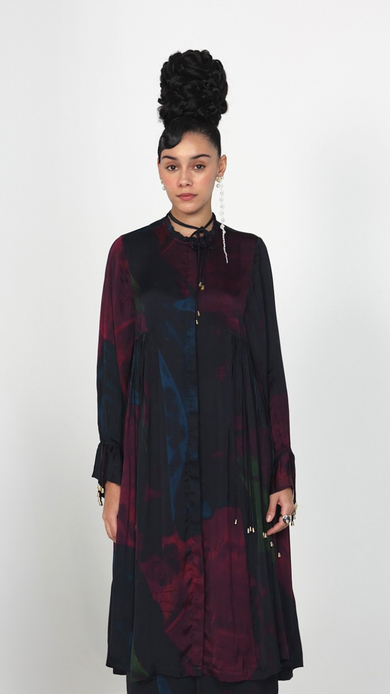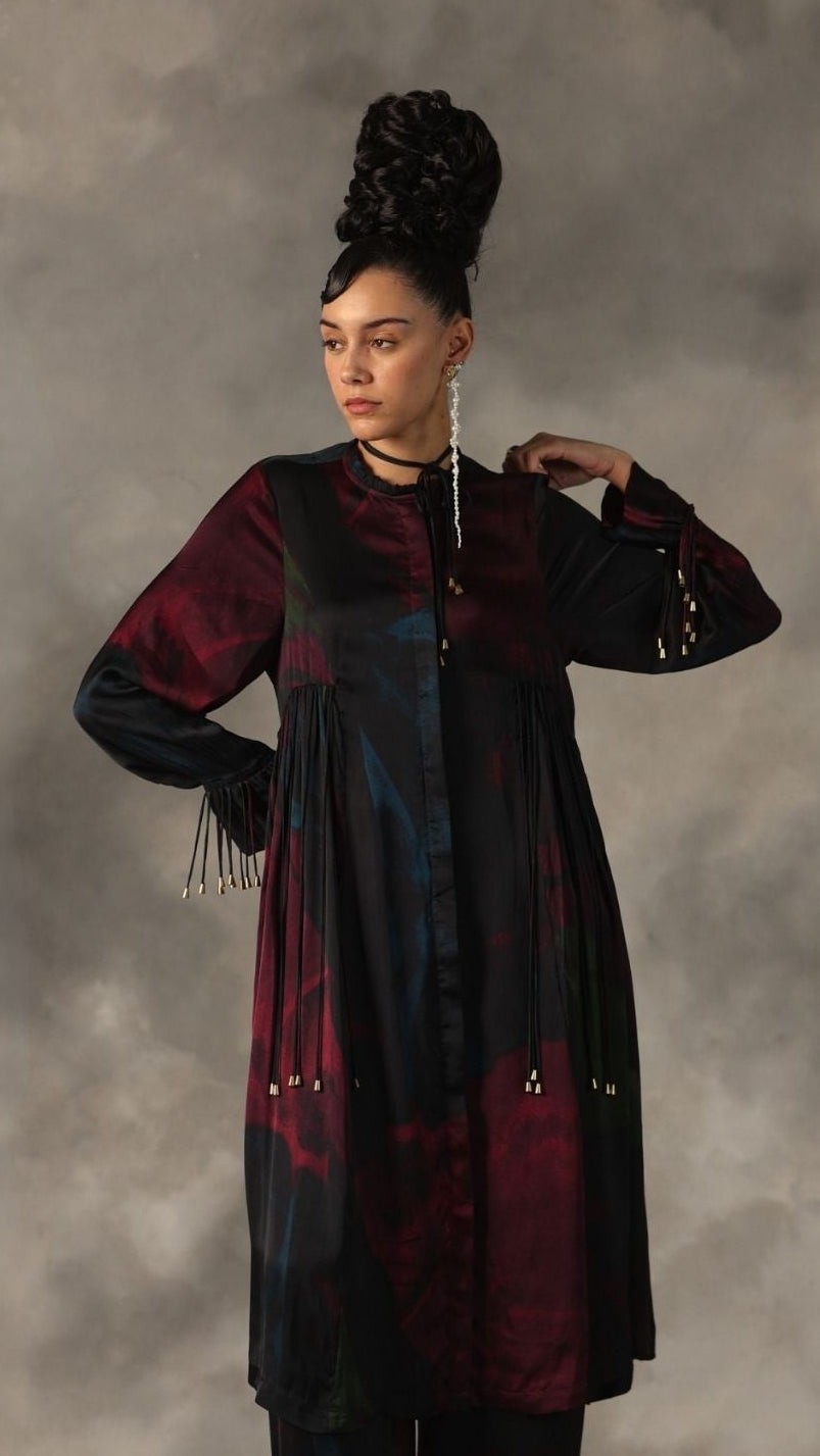 The flow set features Long top and relaxed fit top with a gathered waist and frill-detailed collar and cord tassel with metal drops on end. Crafted in Bamberg satin