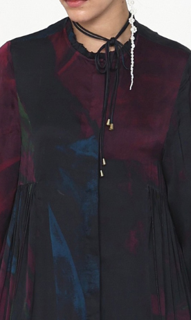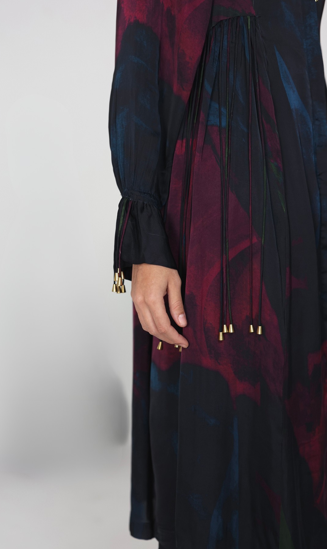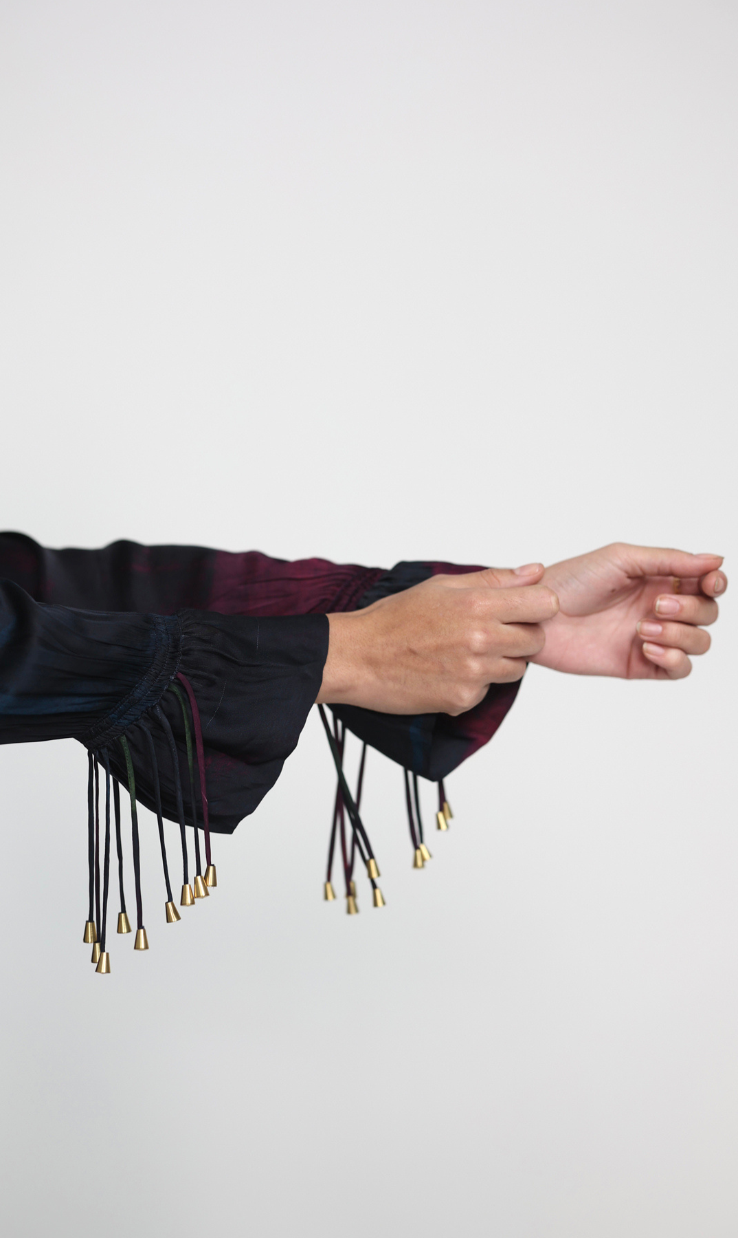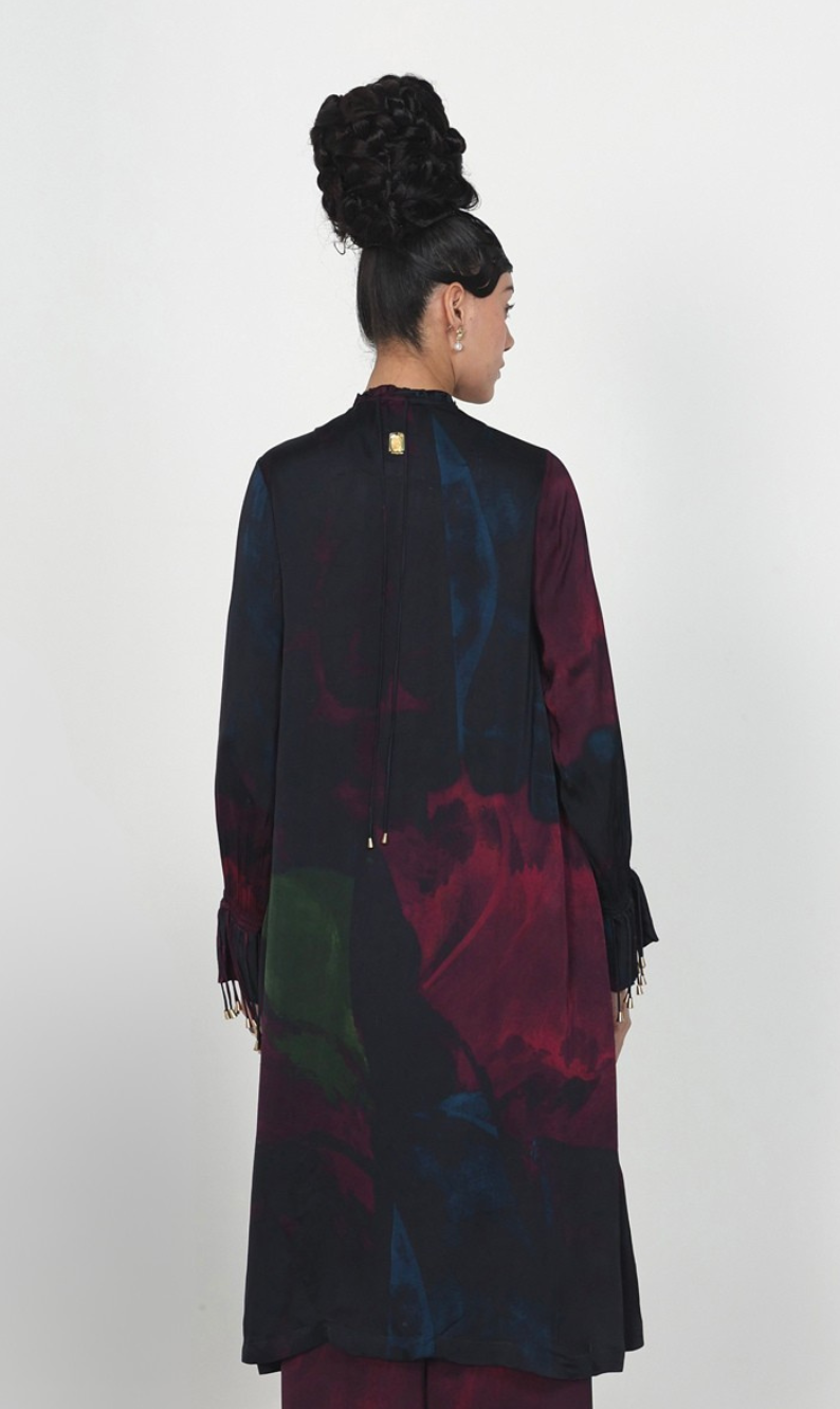 The flow set features Long top and relaxed fit top with a gathered waist and frill-detailed collar and cord tassel with metal drops on end. Crafted in Bamberg satin