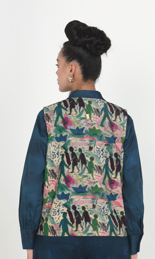 The Harmony features a narrative based artwork sleeveless open vest layered crafted in cotton corduroy lycra. Corduroy sleeveless open vest with LOV MARK
