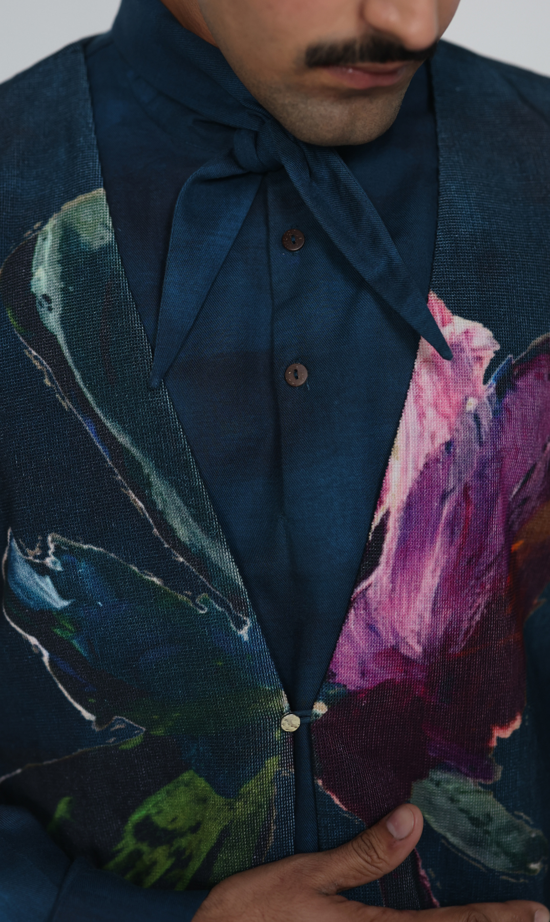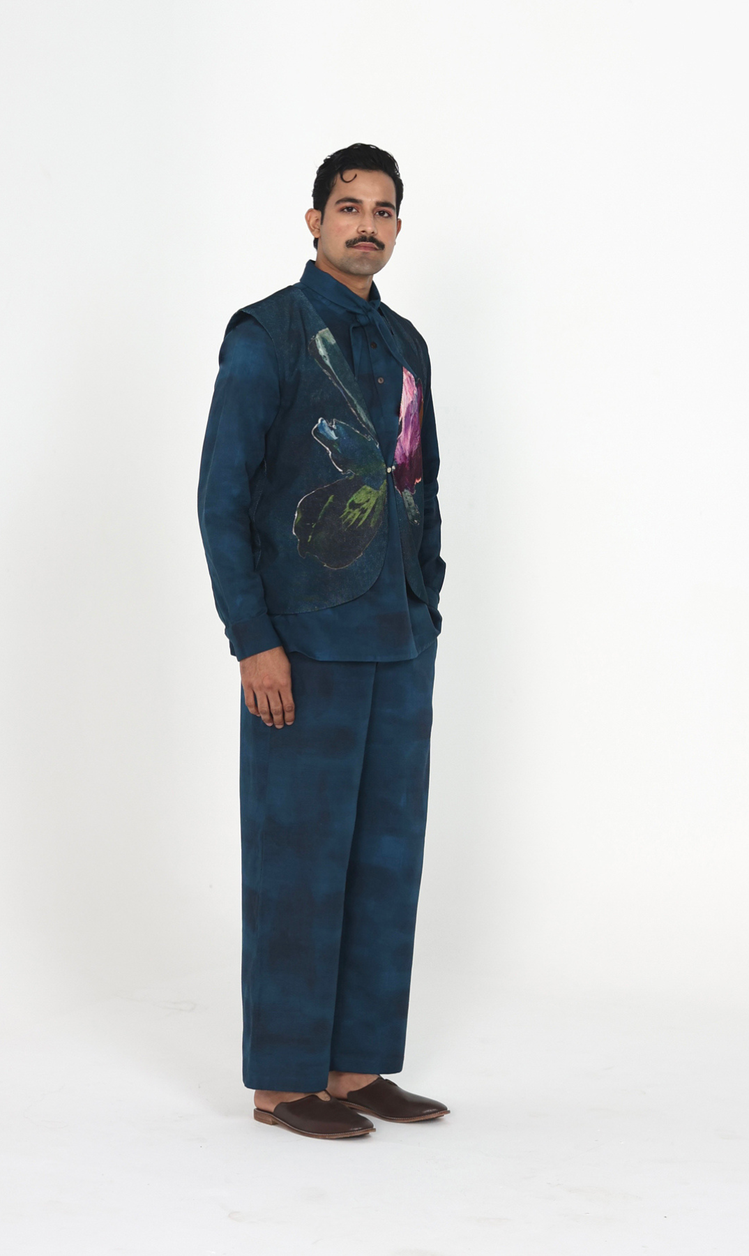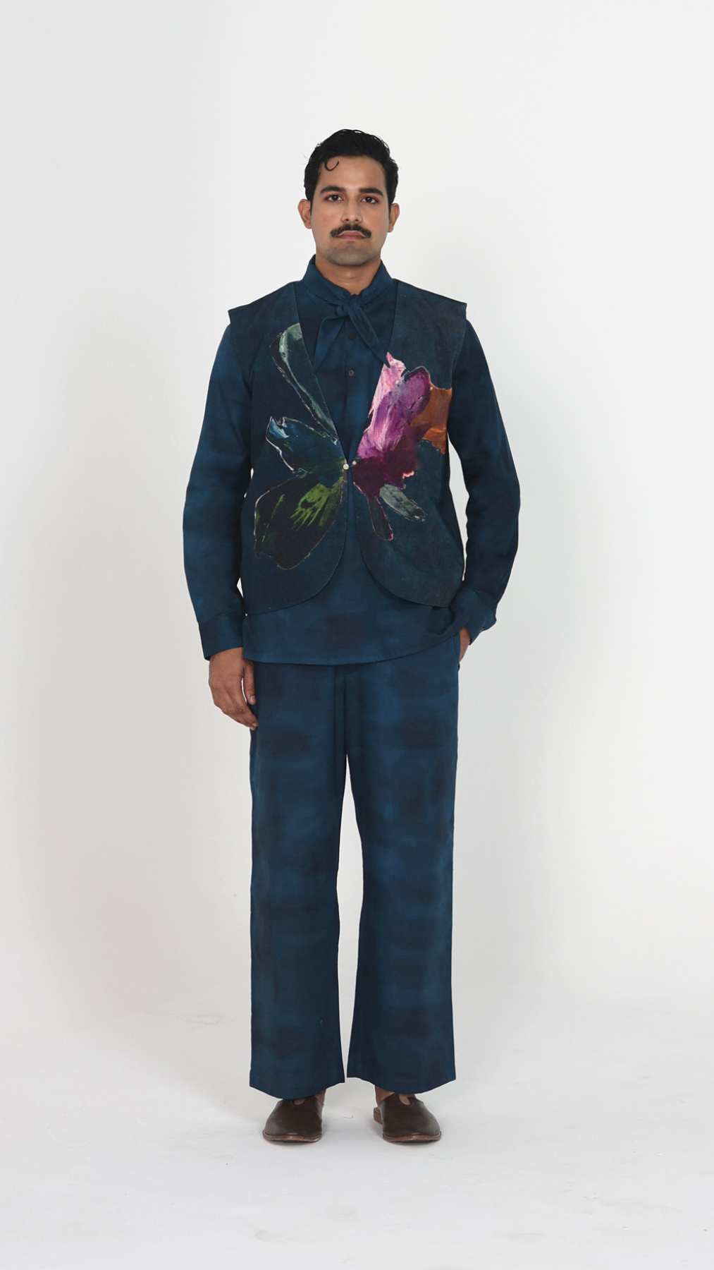 The Painterly set features a dark teal shirt and matching wide-leg trousers layered with a vibrant abstract floral butterfly-motif vest,